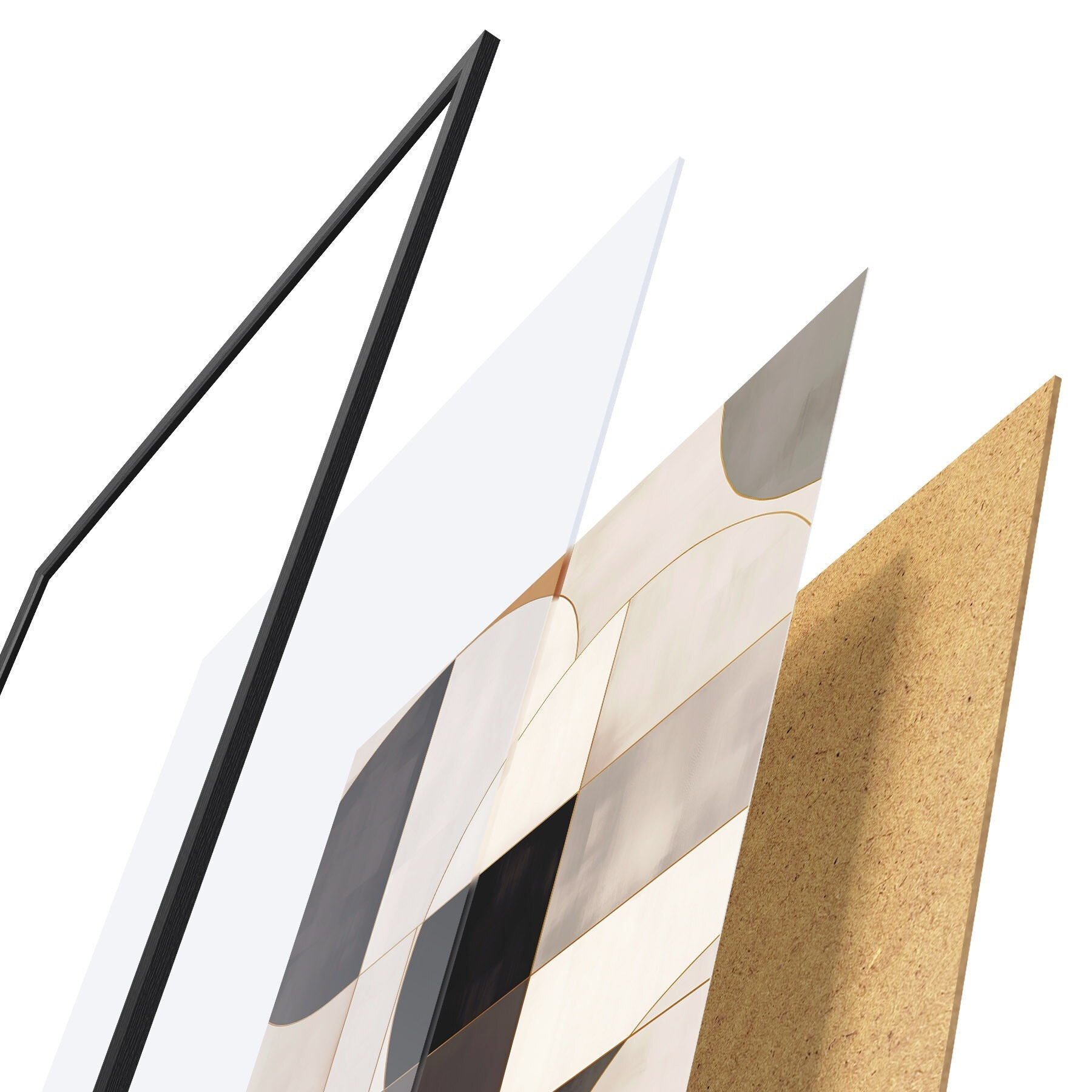 De poster bestaat uit een frame, plexiglas, geprinte afbeelding en spaanplaat achterkant. De poster kan meteen aan de muur worden gehangen dankzij de bevestigingen op de achterkant.