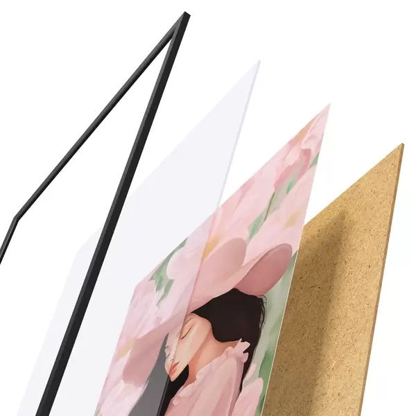 De poster bestaat uit een frame, plexiglas, geprinte afbeelding en spaanplaat achterkant. De poster kan meteen aan de muur worden gehangen dankzij de bevestigingen op de achterkant.