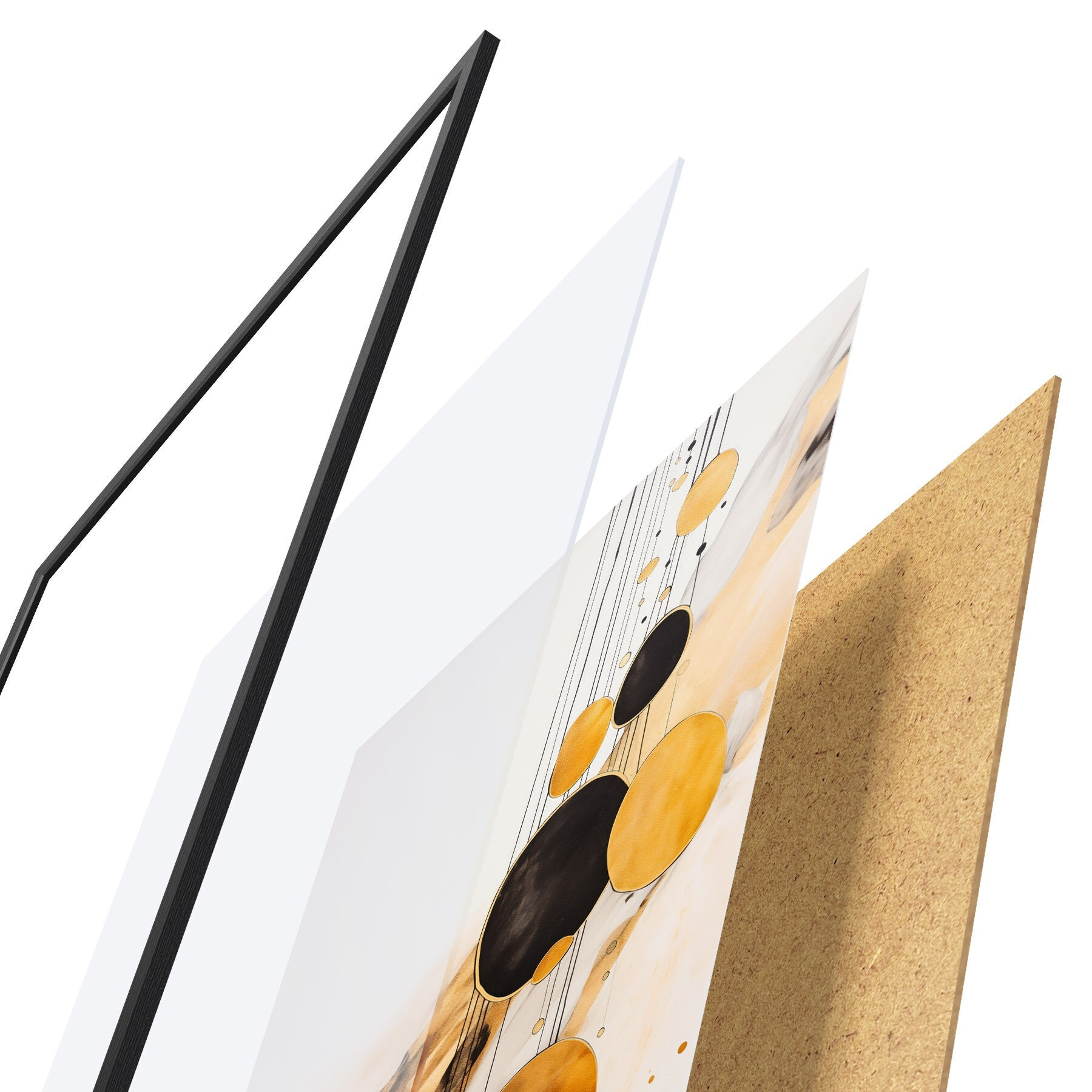 De poster bestaat uit een frame, plexiglas, geprinte afbeelding en spaanplaat achterkant. De poster kan meteen aan de muur worden gehangen dankzij de bevestigingen op de achterkant.