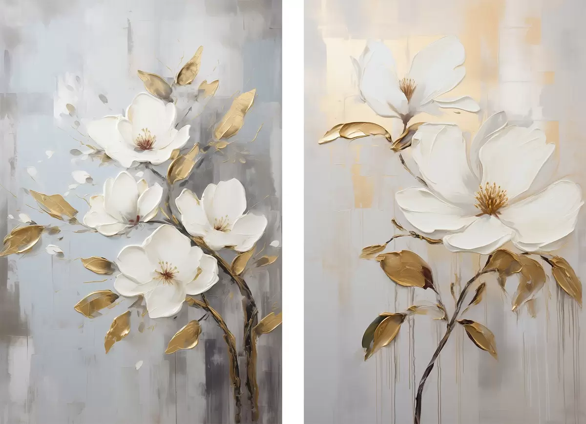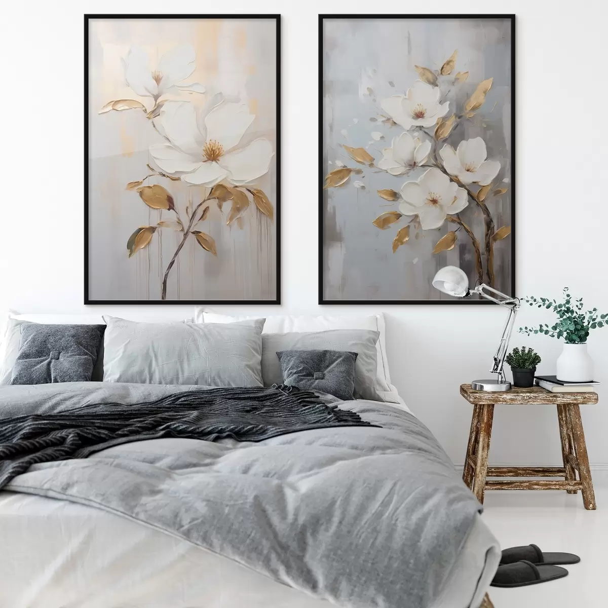 Poster Twee witte bloemen met geeloranje bladeren op een lichte achtergrond N° d00687