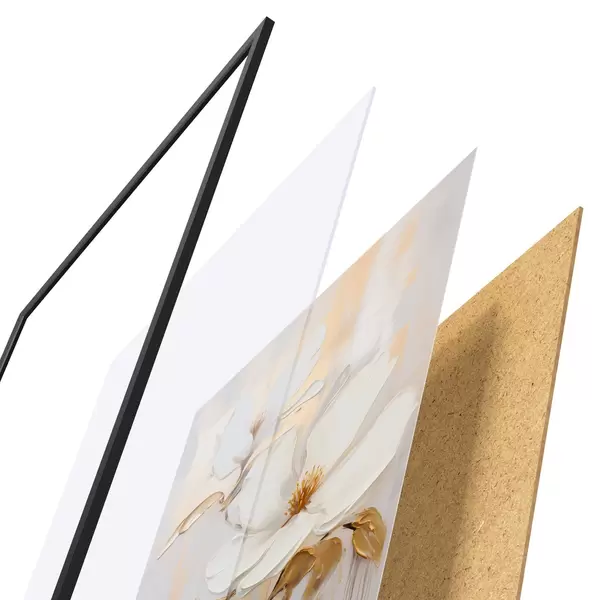 De poster bestaat uit een frame, plexiglas, geprinte afbeelding en spaanplaat achterkant. De poster kan meteen aan de muur worden gehangen dankzij de bevestigingen op de achterkant.