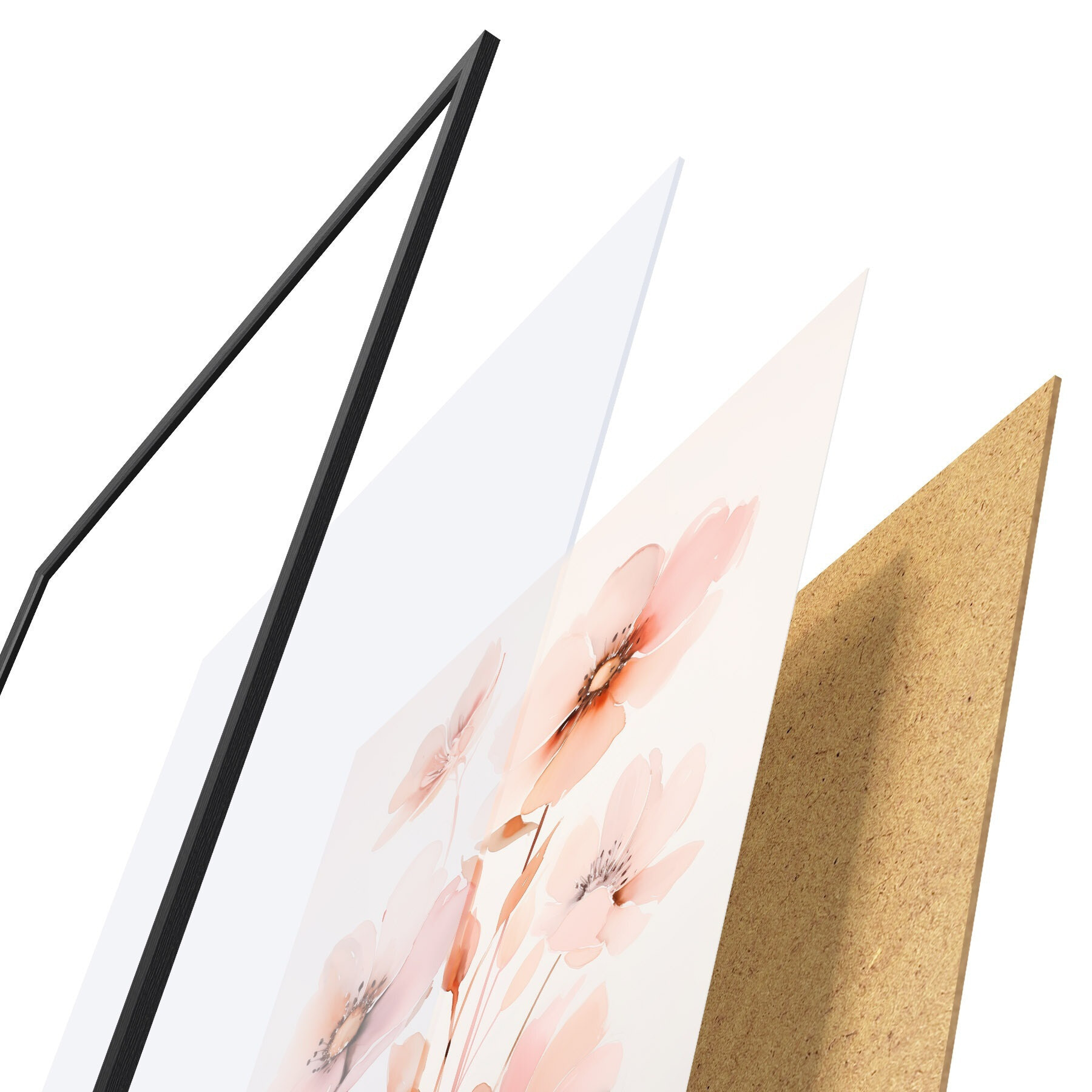 De poster bestaat uit een frame, plexiglas, geprinte afbeelding en spaanplaat achterkant. De poster kan meteen aan de muur worden gehangen dankzij de bevestigingen op de achterkant.
