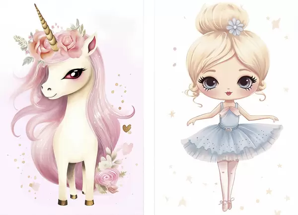 Poster Ballerina pop in een blauwe jurk en eenhoorn met roze manen N° d00692