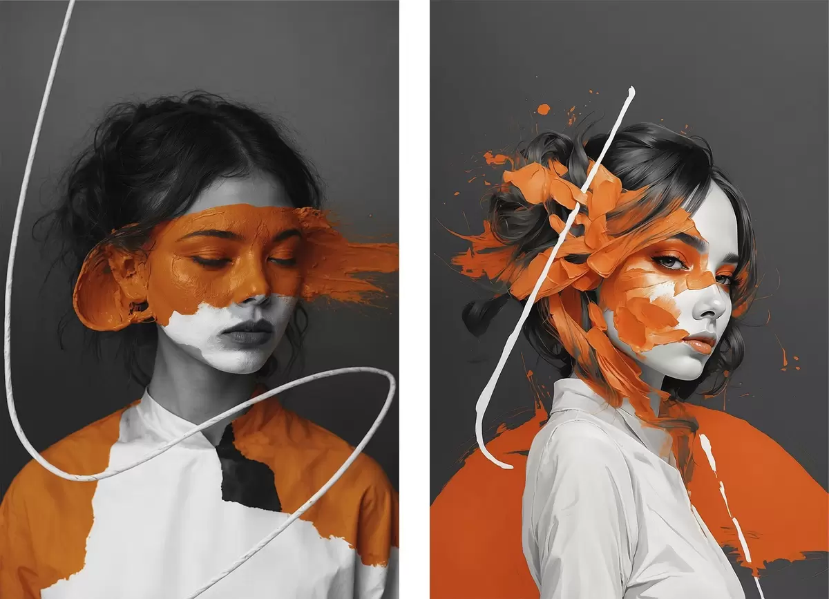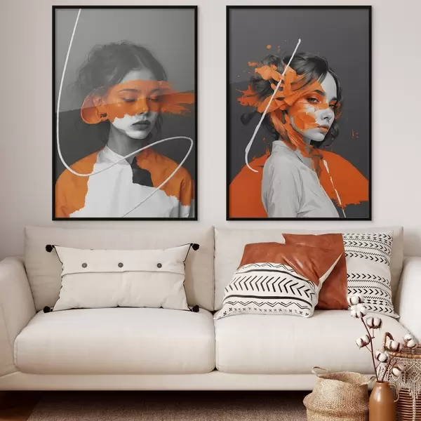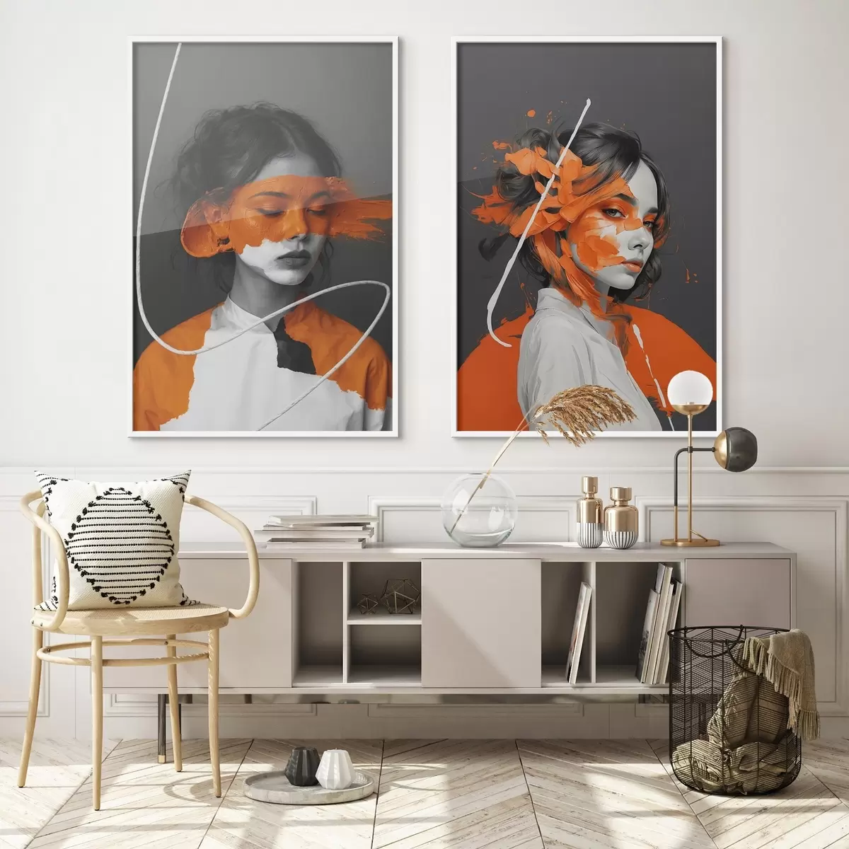 Poster Portretten van meisjes met abstracte oranje penseelstreken N° d00693