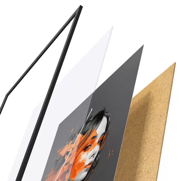 De poster bestaat uit een frame, plexiglas, geprinte afbeelding en spaanplaat achterkant. De poster kan meteen aan de muur worden gehangen dankzij de bevestigingen op de achterkant.