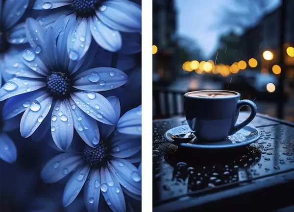 Poster Blauwe bloemen met waterdruppels en een kopje koffie in de regen N° d00694