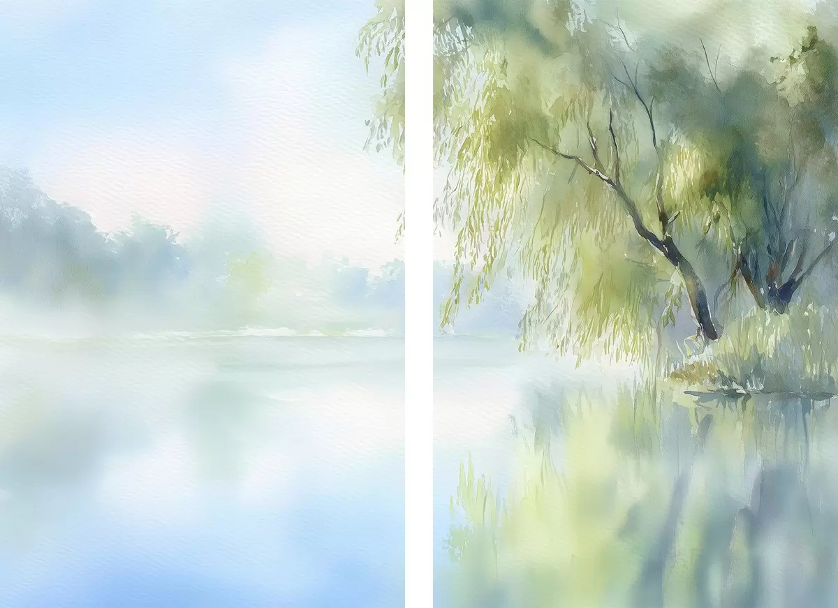 Poster wilgenboom aan de oever van het meer in aquarelstijl d00702