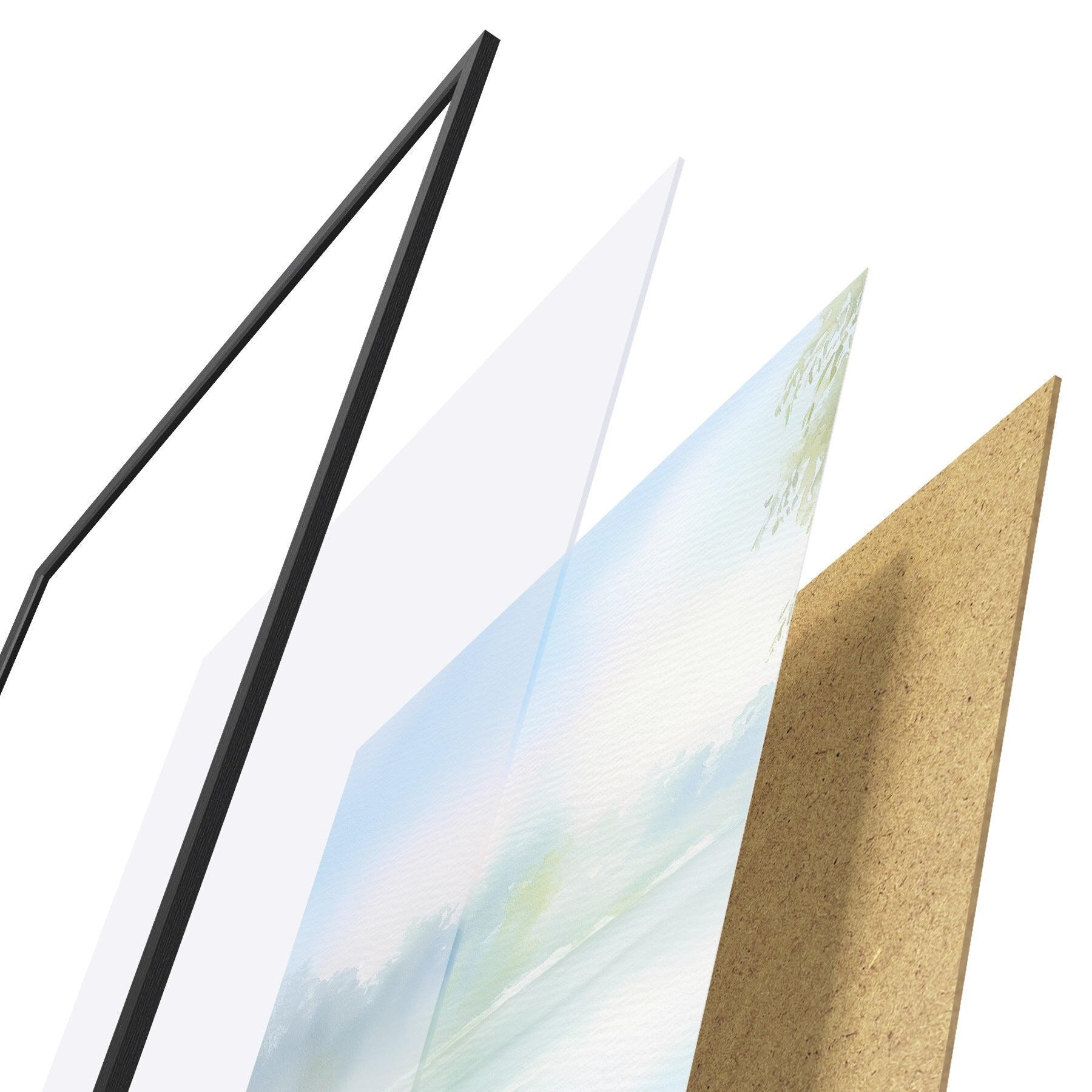 De poster bestaat uit een frame, plexiglas, geprinte afbeelding en spaanplaat achterkant. De poster kan meteen aan de muur worden gehangen dankzij de bevestigingen op de achterkant.