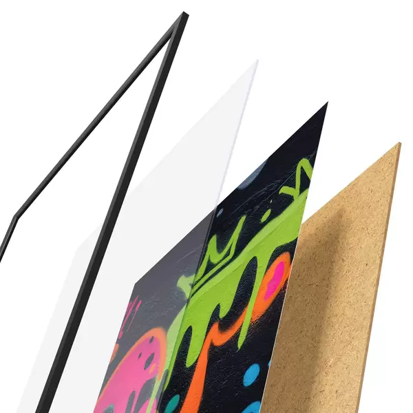 De poster bestaat uit een frame, plexiglas, geprinte afbeelding en spaanplaat achterkant. De poster kan meteen aan de muur worden gehangen dankzij de bevestigingen op de achterkant.