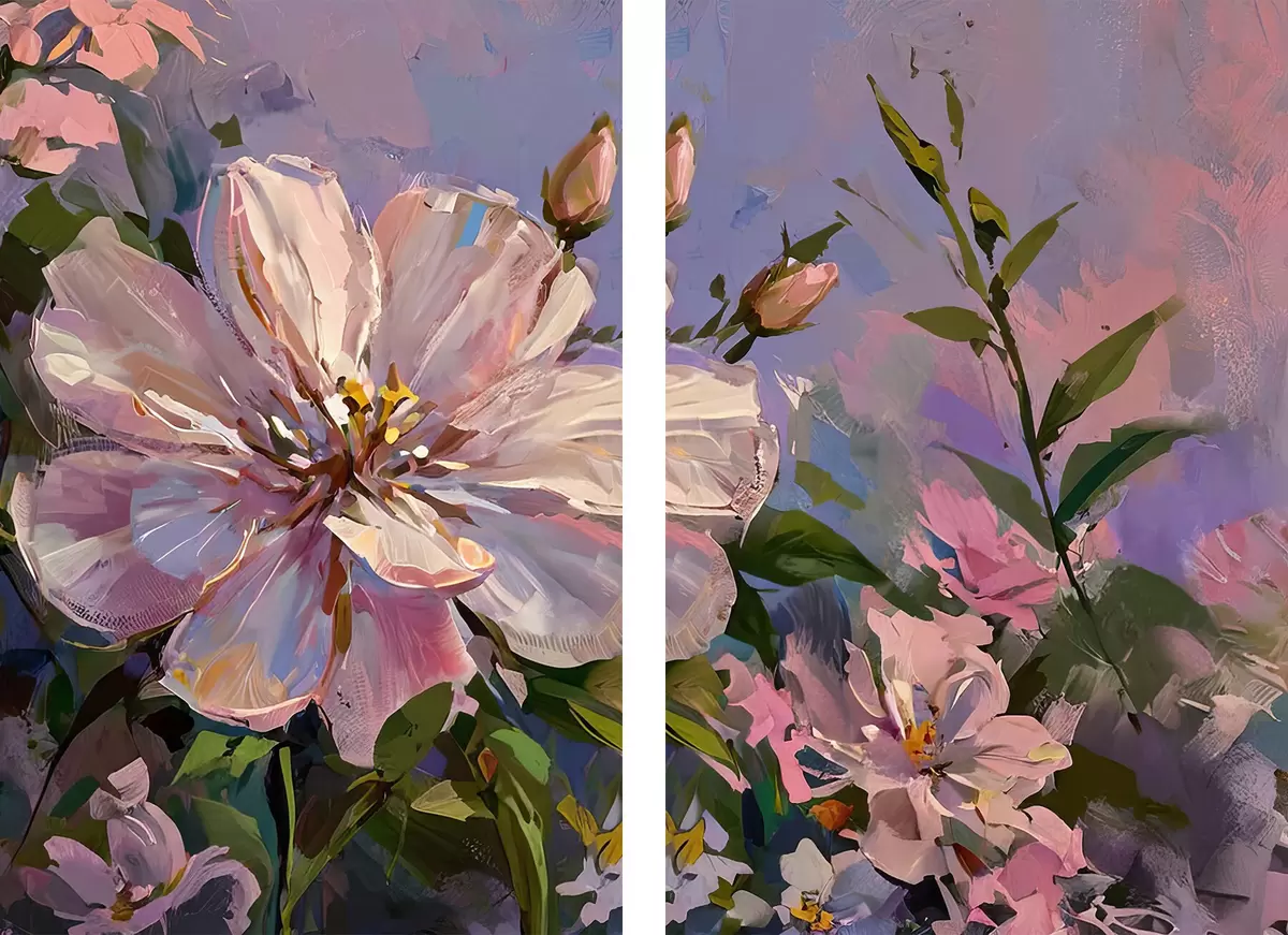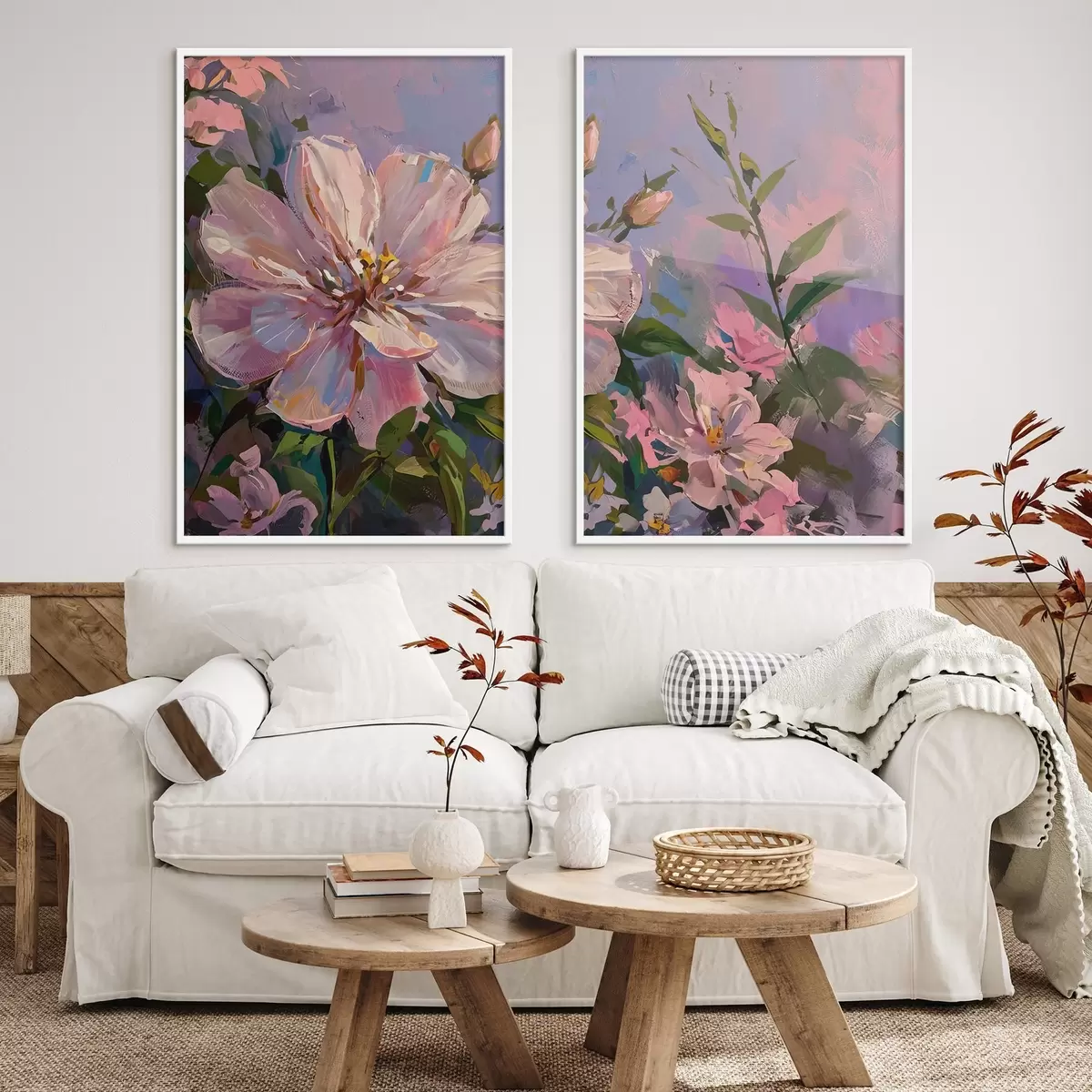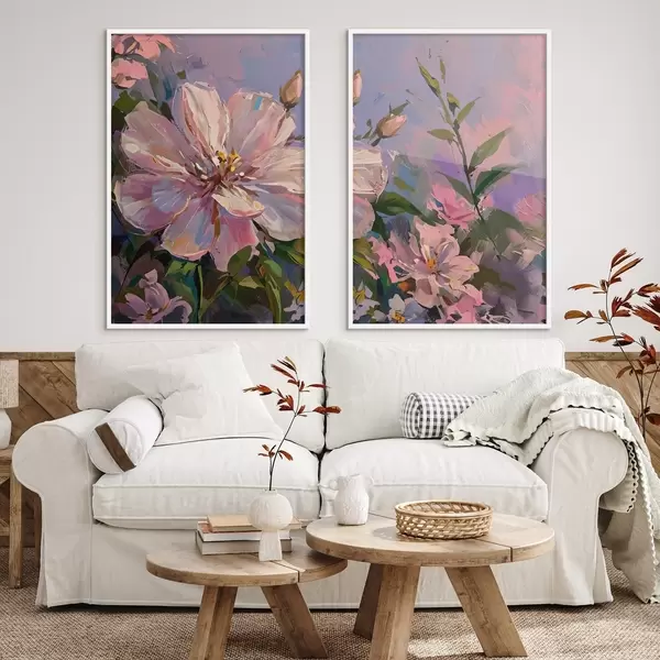 Poster roze bloemen in de stijl van een olieverfschilderij N° d00706
