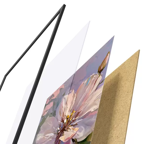 De poster bestaat uit een frame, plexiglas, geprinte afbeelding en spaanplaat achterkant. De poster kan meteen aan de muur worden gehangen dankzij de bevestigingen op de achterkant.