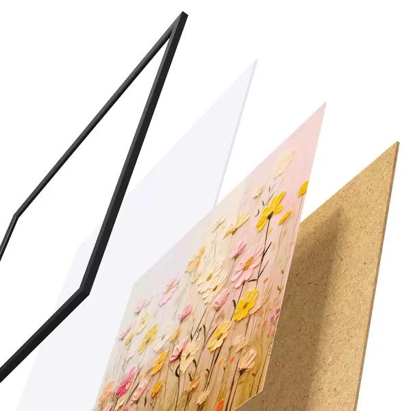 De poster bestaat uit een frame, plexiglas, geprinte afbeelding en spaanplaat achterkant. De poster kan meteen aan de muur worden gehangen dankzij de bevestigingen op de achterkant.