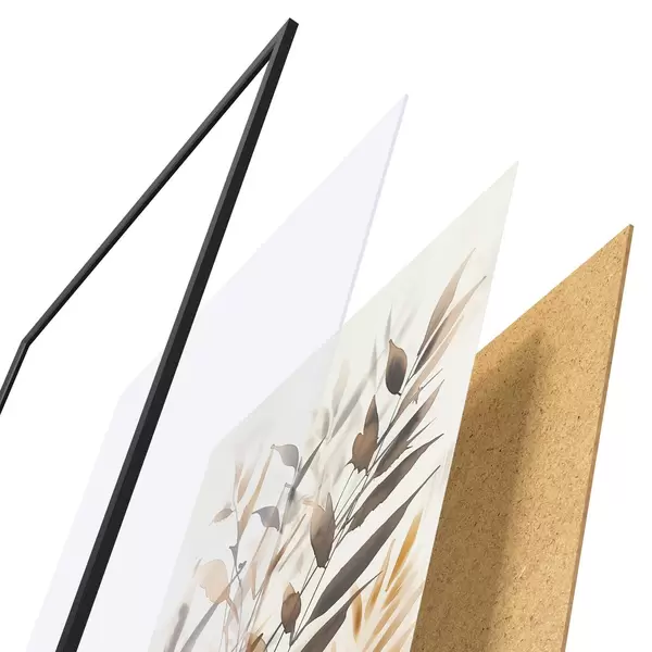 De poster bestaat uit een frame, plexiglas, geprinte afbeelding en spaanplaat achterkant. De poster kan meteen aan de muur worden gehangen dankzij de bevestigingen op de achterkant.