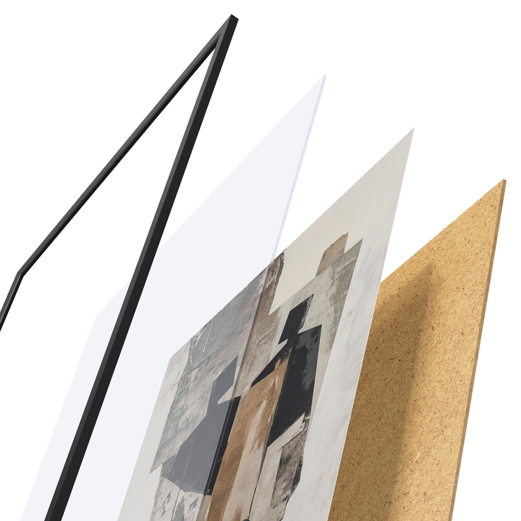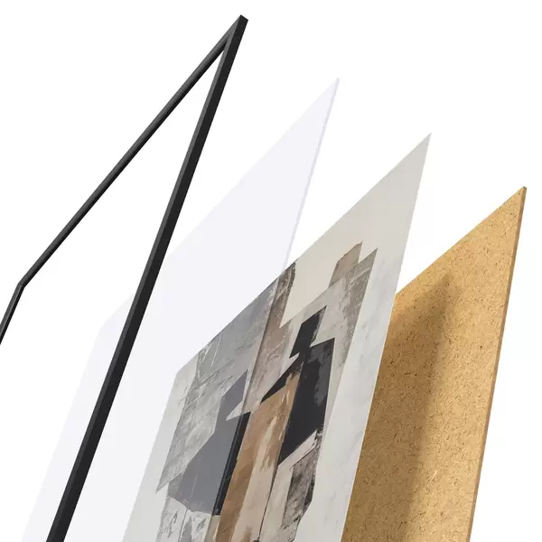 De poster bestaat uit een frame, plexiglas, geprinte afbeelding en spaanplaat achterkant. De poster kan meteen aan de muur worden gehangen dankzij de bevestigingen op de achterkant.