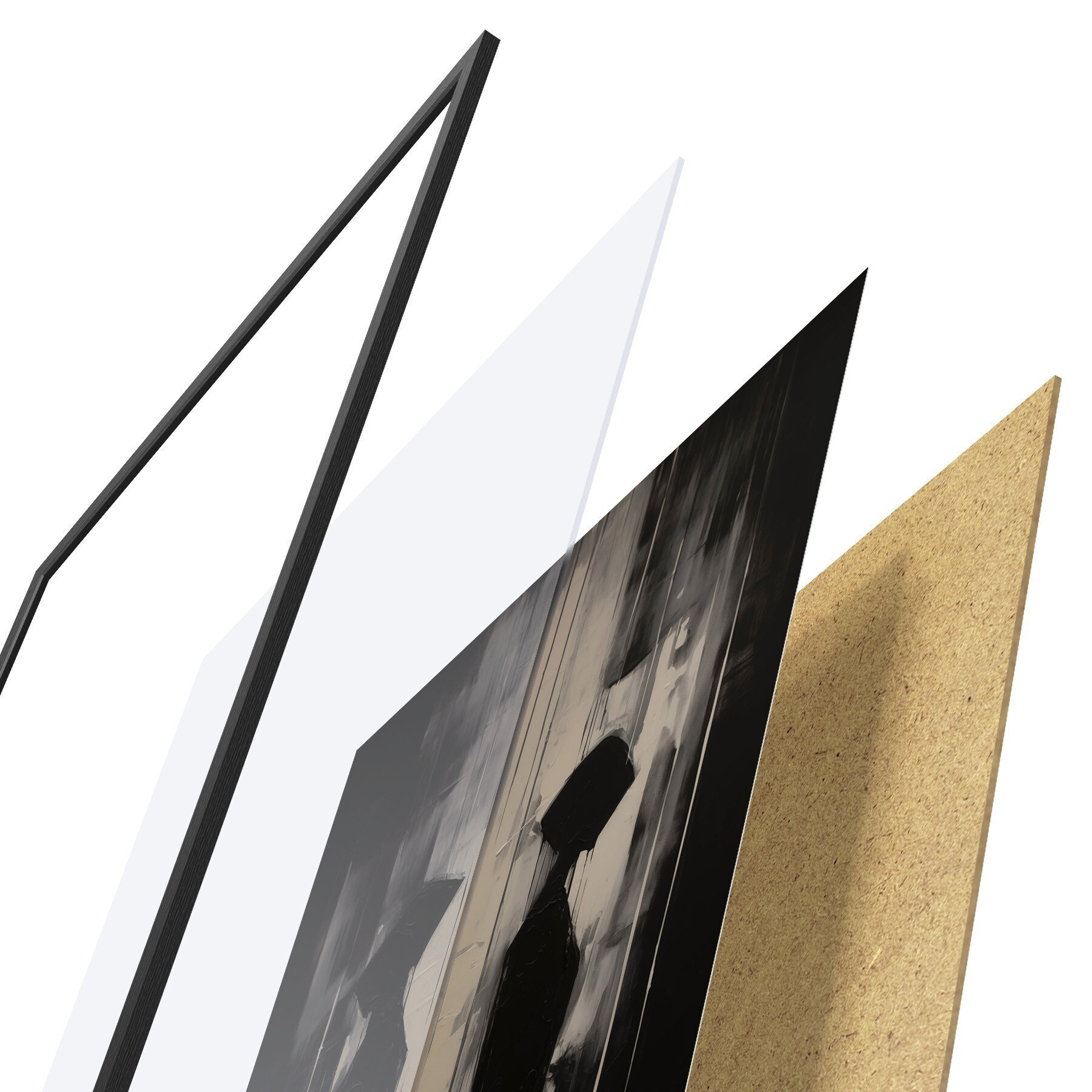 De poster bestaat uit een frame, plexiglas, geprinte afbeelding en spaanplaat achterkant. De poster kan meteen aan de muur worden gehangen dankzij de bevestigingen op de achterkant.