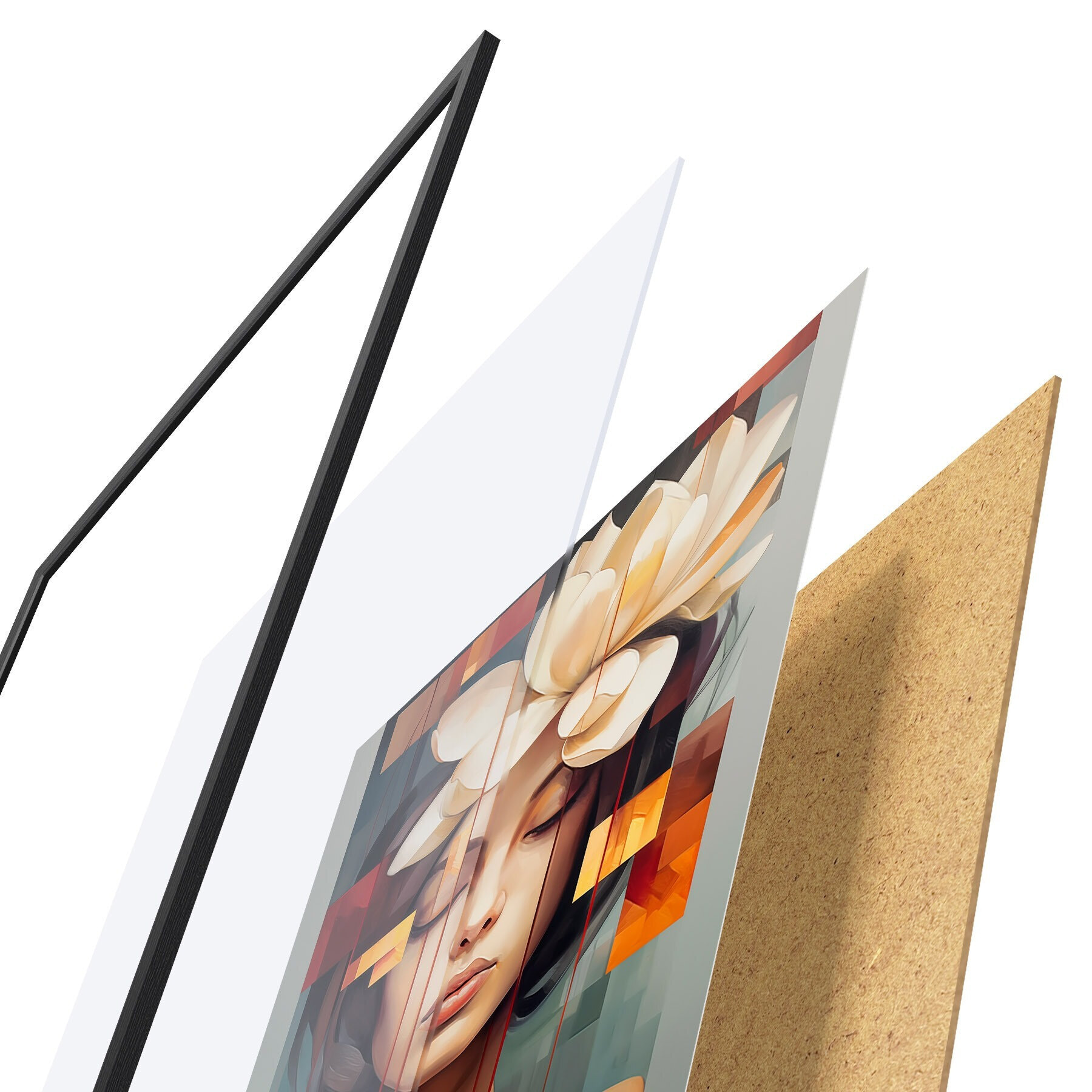 De poster bestaat uit een frame, plexiglas, geprinte afbeelding en spaanplaat achterkant. De poster kan meteen aan de muur worden gehangen dankzij de bevestigingen op de achterkant.