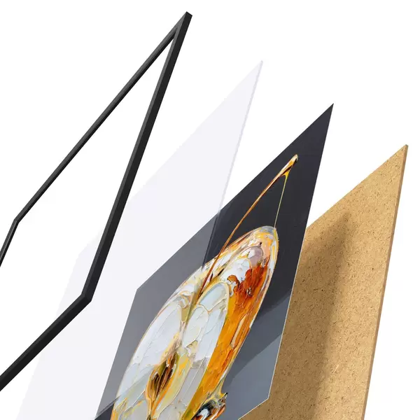 De poster bestaat uit een frame, plexiglas, geprinte afbeelding en spaanplaat achterkant. De poster kan meteen aan de muur worden gehangen dankzij de bevestigingen op de achterkant.