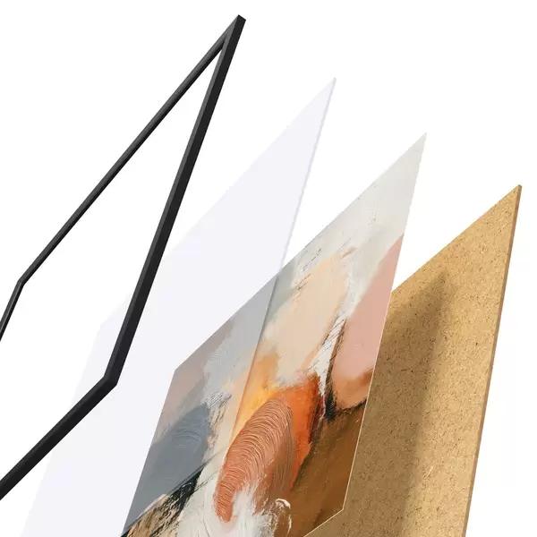 De poster bestaat uit een frame, plexiglas, geprinte afbeelding en spaanplaat achterkant. De poster kan meteen aan de muur worden gehangen dankzij de bevestigingen op de achterkant.