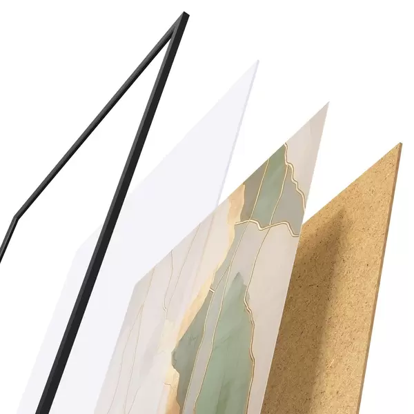 De poster bestaat uit een frame, plexiglas, geprinte afbeelding en spaanplaat achterkant. De poster kan meteen aan de muur worden gehangen dankzij de bevestigingen op de achterkant.