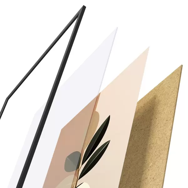 De poster bestaat uit een frame, plexiglas, geprinte afbeelding en spaanplaat achterkant. De poster kan meteen aan de muur worden gehangen dankzij de bevestigingen op de achterkant.