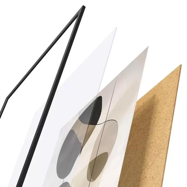 De poster bestaat uit een frame, plexiglas, geprinte afbeelding en spaanplaat achterkant. De poster kan meteen aan de muur worden gehangen dankzij de bevestigingen op de achterkant.