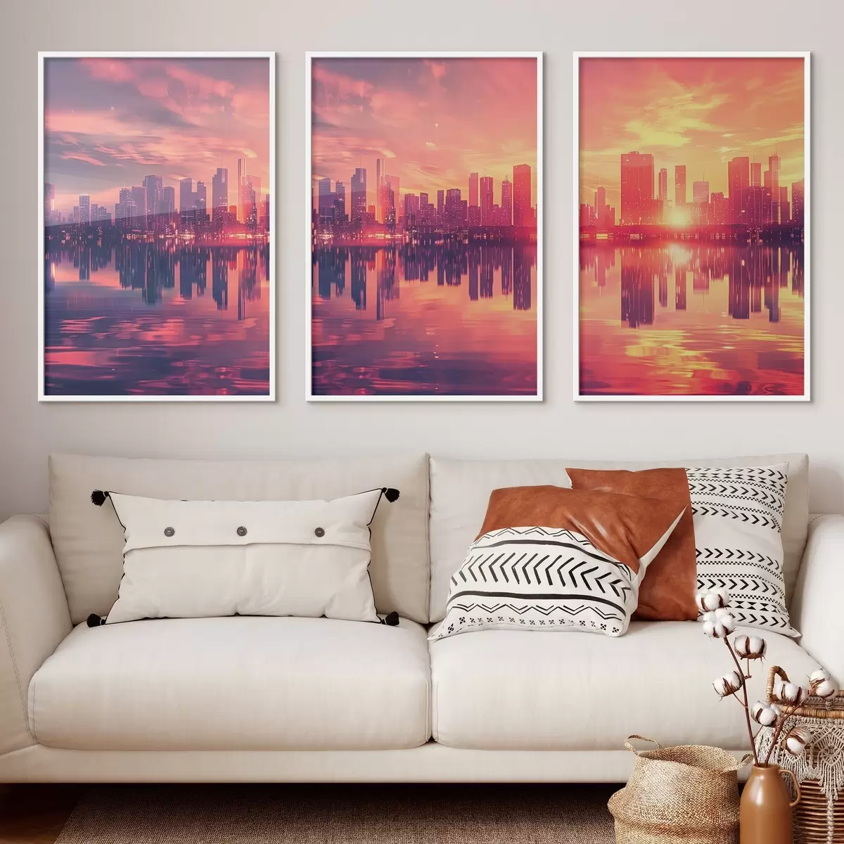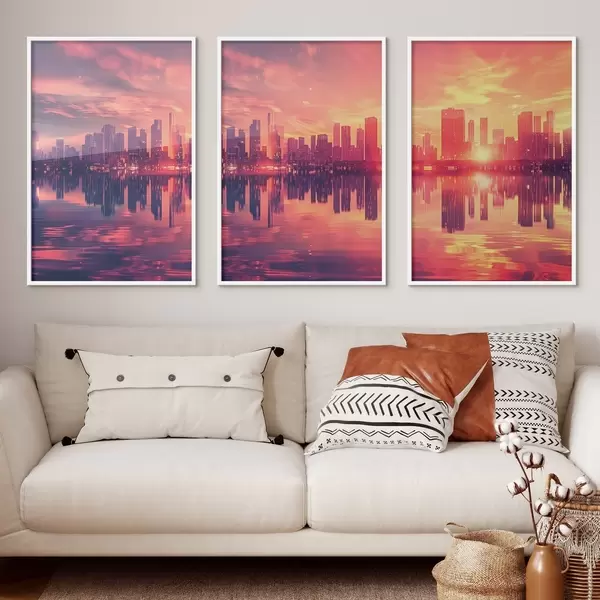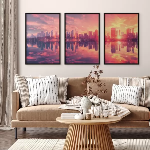 Poster Romantische zonsondergang met een moderne stad op de achtergrond N° d00784