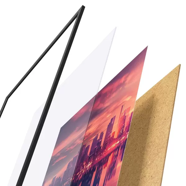 De poster bestaat uit een frame, plexiglas, geprinte afbeelding en spaanplaat achterkant. De poster kan meteen aan de muur worden gehangen dankzij de bevestigingen op de achterkant.