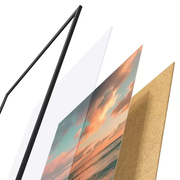 De poster bestaat uit een frame, plexiglas, geprinte afbeelding en spaanplaat achterkant. De poster kan meteen aan de muur worden gehangen dankzij de bevestigingen op de achterkant.