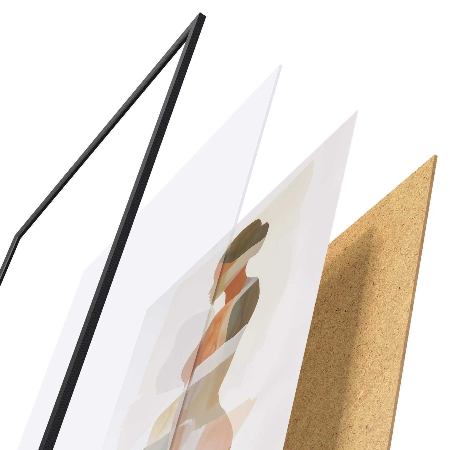 De poster bestaat uit een frame, plexiglas, geprinte afbeelding en spaanplaat achterkant. De poster kan meteen aan de muur worden gehangen dankzij de bevestigingen op de achterkant.