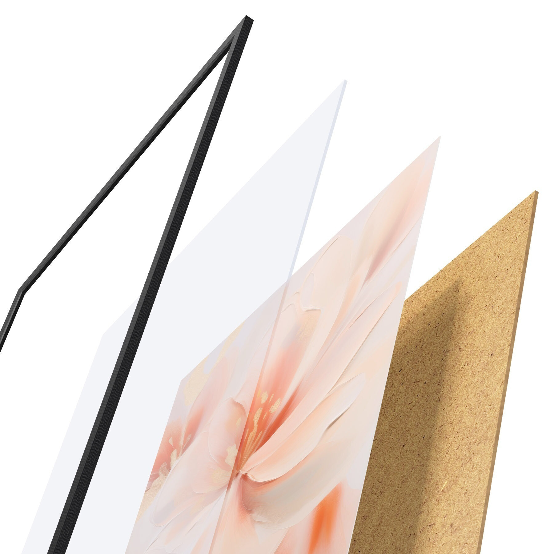 De poster bestaat uit een frame, plexiglas, geprinte afbeelding en spaanplaat achterkant. De poster kan meteen aan de muur worden gehangen dankzij de bevestigingen op de achterkant.