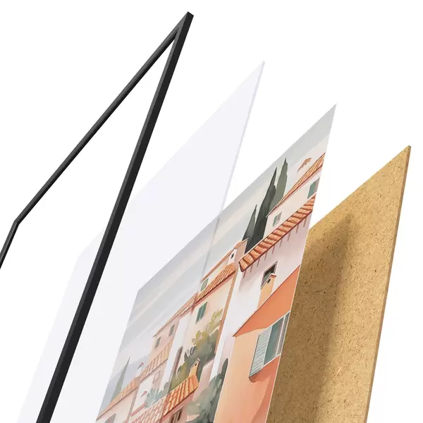 De poster bestaat uit een frame, plexiglas, geprinte afbeelding en spaanplaat achterkant. De poster kan meteen aan de muur worden gehangen dankzij de bevestigingen op de achterkant.