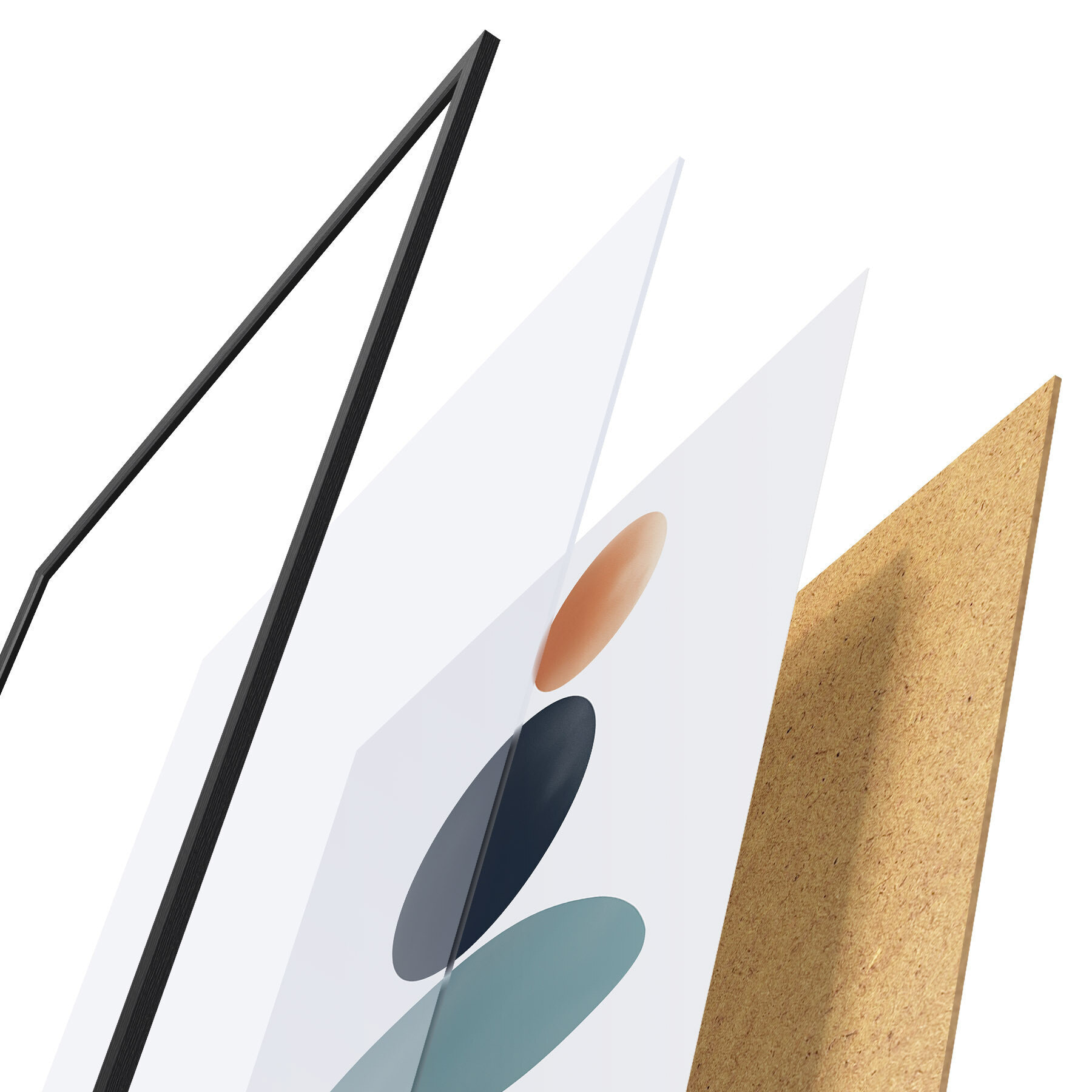 De poster bestaat uit een frame, plexiglas, geprinte afbeelding en spaanplaat achterkant. De poster kan meteen aan de muur worden gehangen dankzij de bevestigingen op de achterkant.