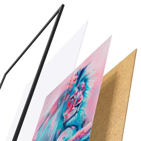 De poster bestaat uit een frame, plexiglas, geprinte afbeelding en spaanplaat achterkant. De poster kan meteen aan de muur worden gehangen dankzij de bevestigingen op de achterkant.