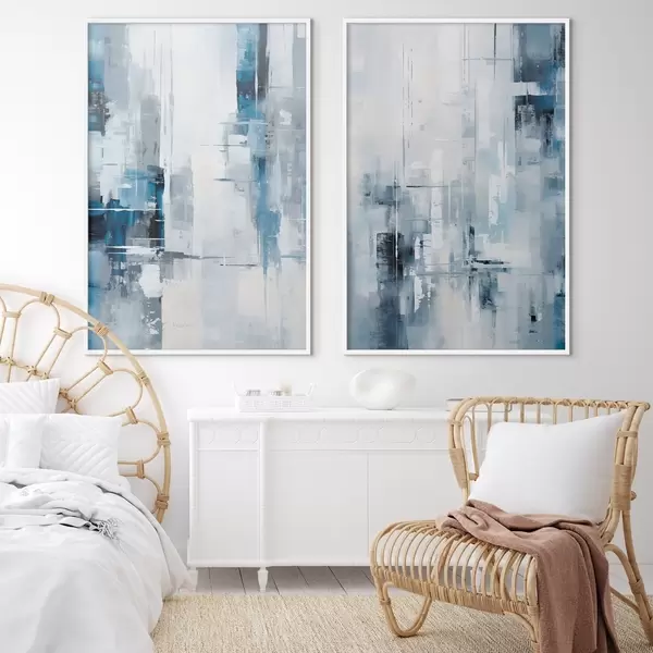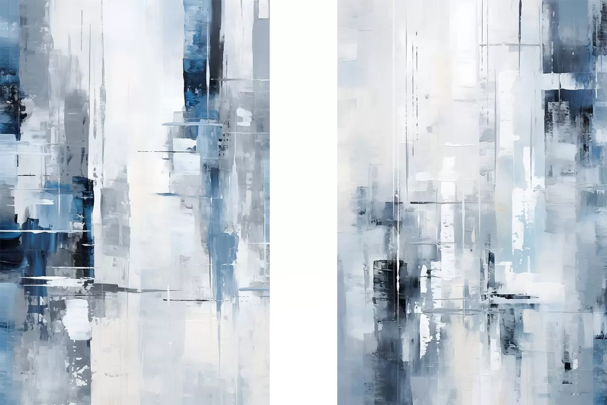 Poster Abstracte schilderijimitatie met blauwe, grijze en witte kleuren, verticale lijnen en geometrische vormen d00819