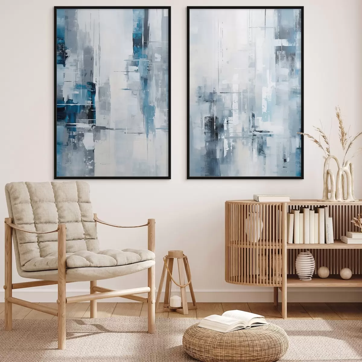 Poster Abstracte schilderijimitatie met blauwe, grijze en witte kleuren, verticale lijnen en geometrische vormen N° d00819