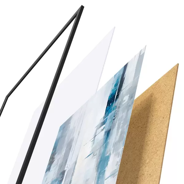 De poster bestaat uit een frame, plexiglas, geprinte afbeelding en spaanplaat achterkant. De poster kan meteen aan de muur worden gehangen dankzij de bevestigingen op de achterkant.