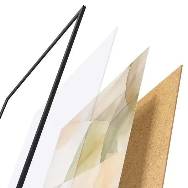 De poster bestaat uit een frame, plexiglas, geprinte afbeelding en spaanplaat achterkant. De poster kan meteen aan de muur worden gehangen dankzij de bevestigingen op de achterkant.