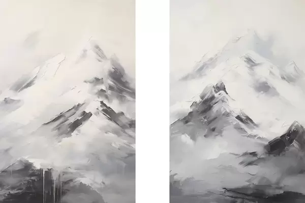Poster Besneeuwde bergtoppen met grijze schaduwen, grijze lucht, penseelstreken, gestructureerd, minimalistisch d00822