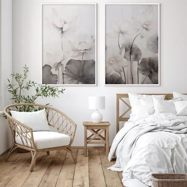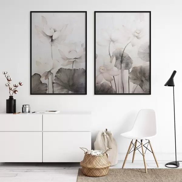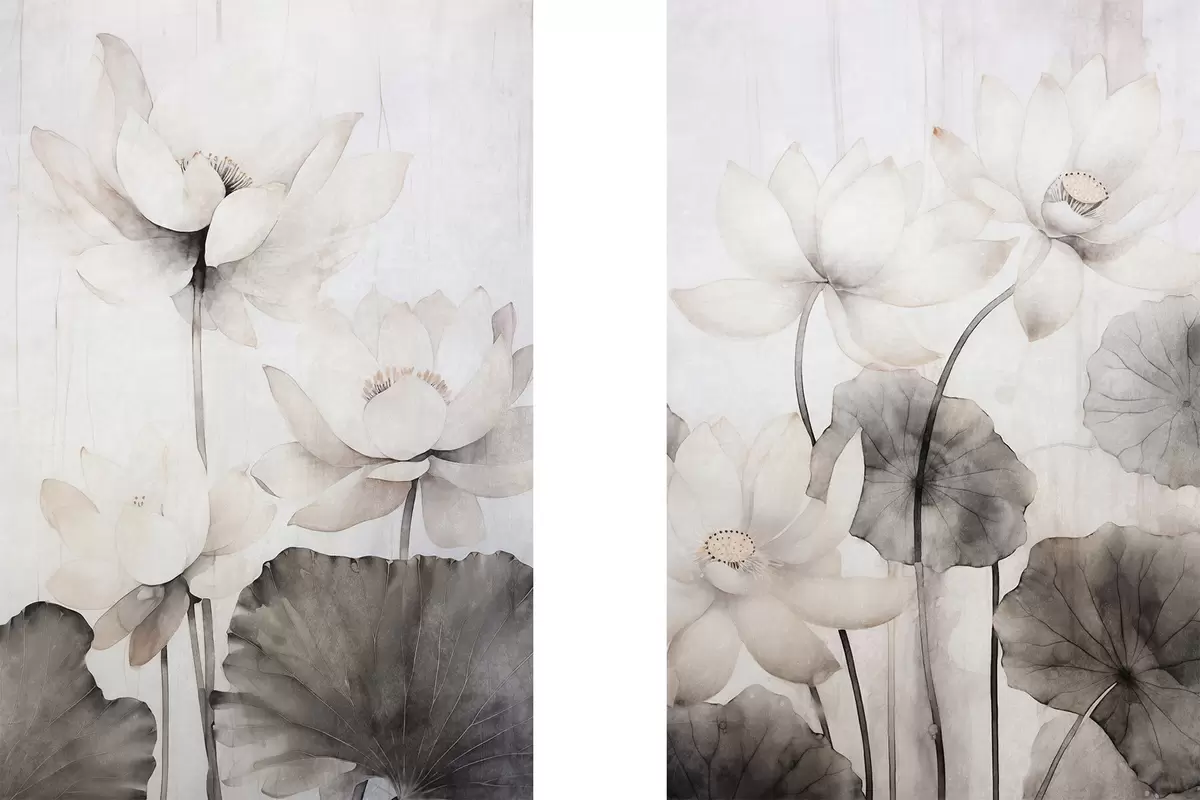 Poster Witte lotusbloemen met textuur en donkere bladeren, lichte achtergrond, minimalistisch ontwerp N° d00824
