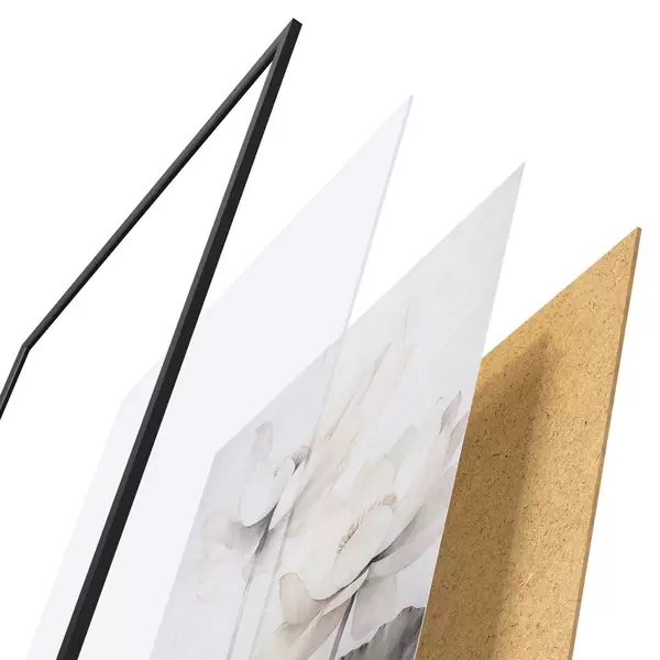 De poster bestaat uit een frame, plexiglas, geprinte afbeelding en spaanplaat achterkant. De poster kan meteen aan de muur worden gehangen dankzij de bevestigingen op de achterkant.