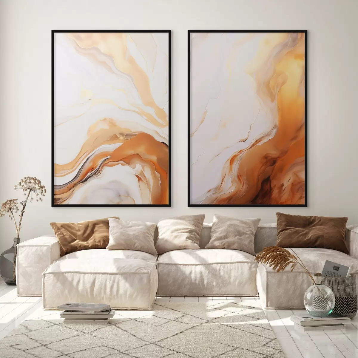 Poster Abstracte schilderkunst imitatie met witte en oranje kleuren, vloeiende kunst met golvende lijnen, moderne kunst d00825