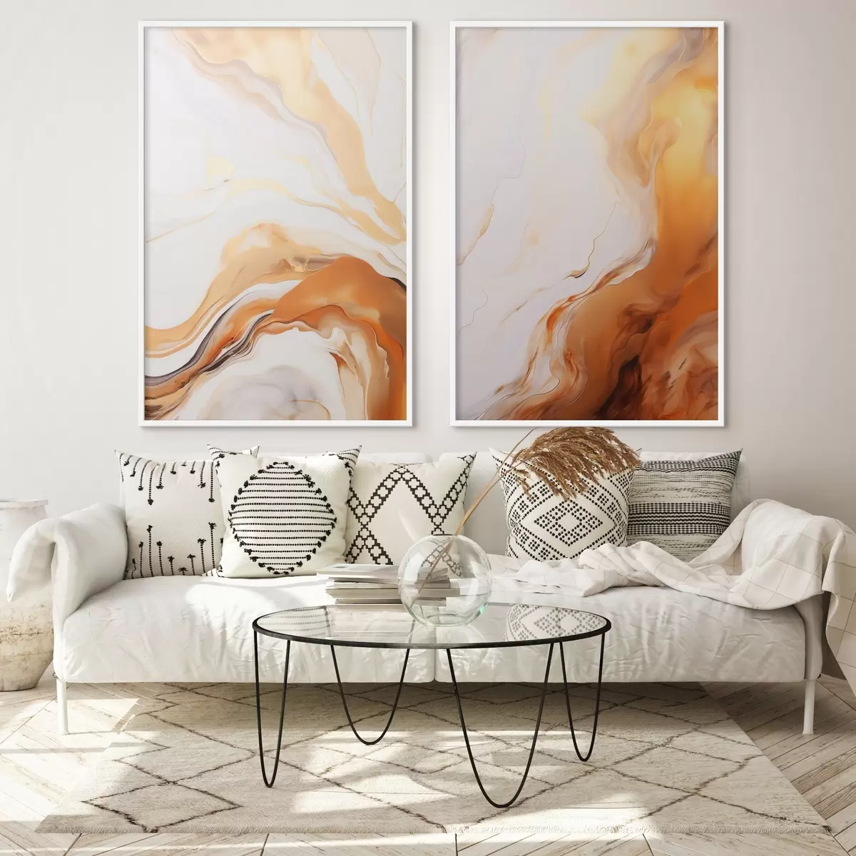 Poster Abstracte schilderkunst imitatie met witte en oranje kleuren, vloeiende kunst met golvende lijnen, moderne kunst N° d00825