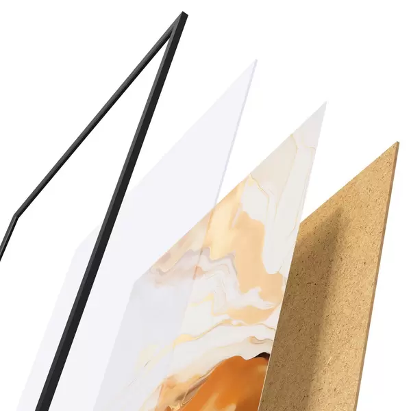 De poster bestaat uit een frame, plexiglas, geprinte afbeelding en spaanplaat achterkant. De poster kan meteen aan de muur worden gehangen dankzij de bevestigingen op de achterkant.