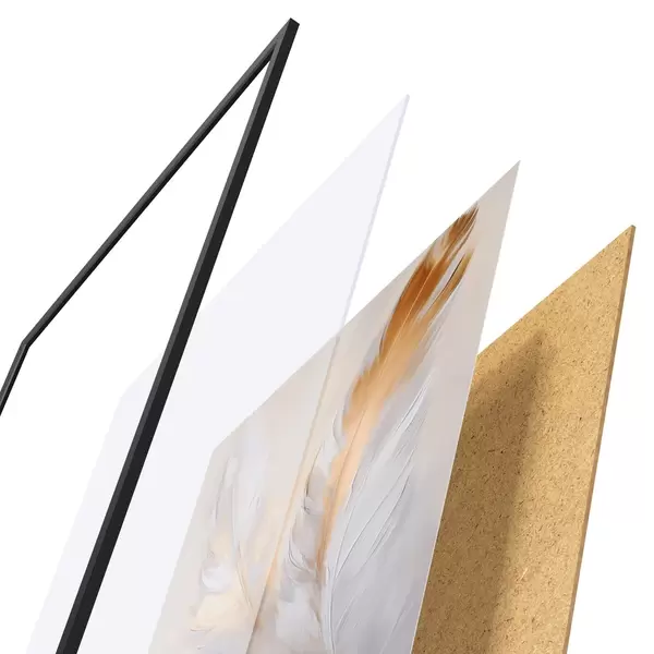 De poster bestaat uit een frame, plexiglas, geprinte afbeelding en spaanplaat achterkant. De poster kan meteen aan de muur worden gehangen dankzij de bevestigingen op de achterkant.
