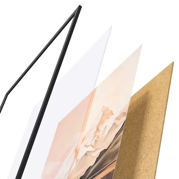 De poster bestaat uit een frame, plexiglas, geprinte afbeelding en spaanplaat achterkant. De poster kan meteen aan de muur worden gehangen dankzij de bevestigingen op de achterkant.