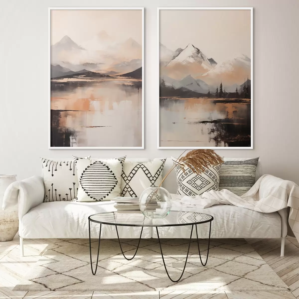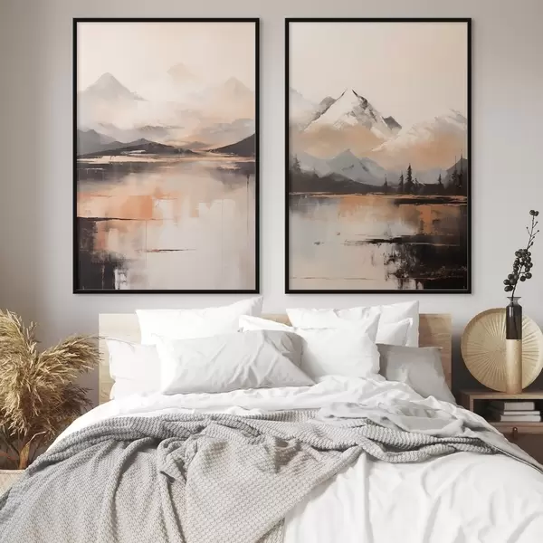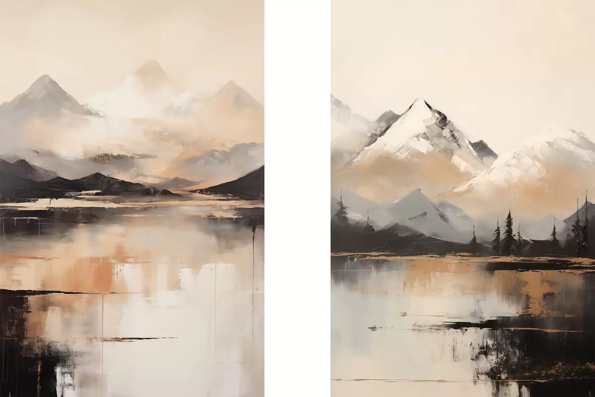 Poster Een landschapsschilderij met textuur dat bergen en een meer imiteert N° d00831