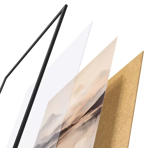 De poster bestaat uit een frame, plexiglas, geprinte afbeelding en spaanplaat achterkant. De poster kan meteen aan de muur worden gehangen dankzij de bevestigingen op de achterkant.