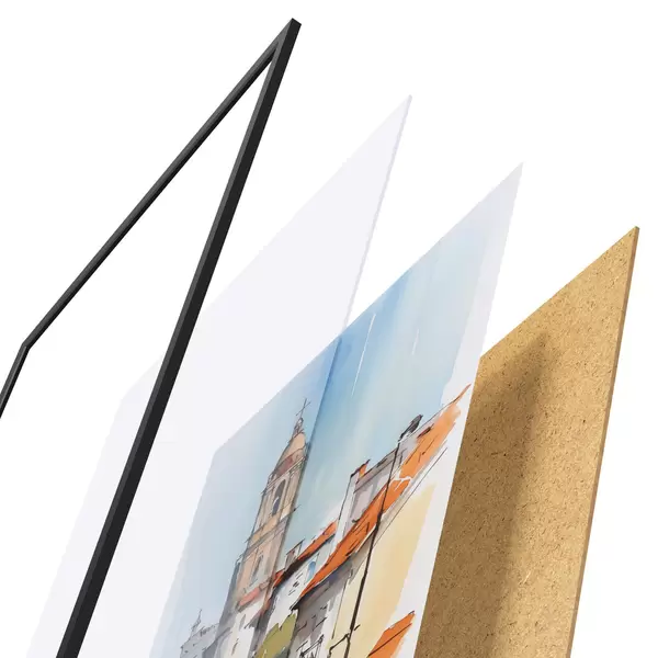 De poster bestaat uit een frame, plexiglas, geprinte afbeelding en spaanplaat achterkant. De poster kan meteen aan de muur worden gehangen dankzij de bevestigingen op de achterkant.