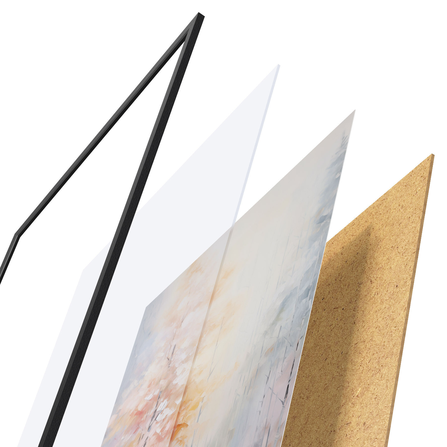 De poster bestaat uit een frame, plexiglas, geprinte afbeelding en spaanplaat achterkant. De poster kan meteen aan de muur worden gehangen dankzij de bevestigingen op de achterkant.