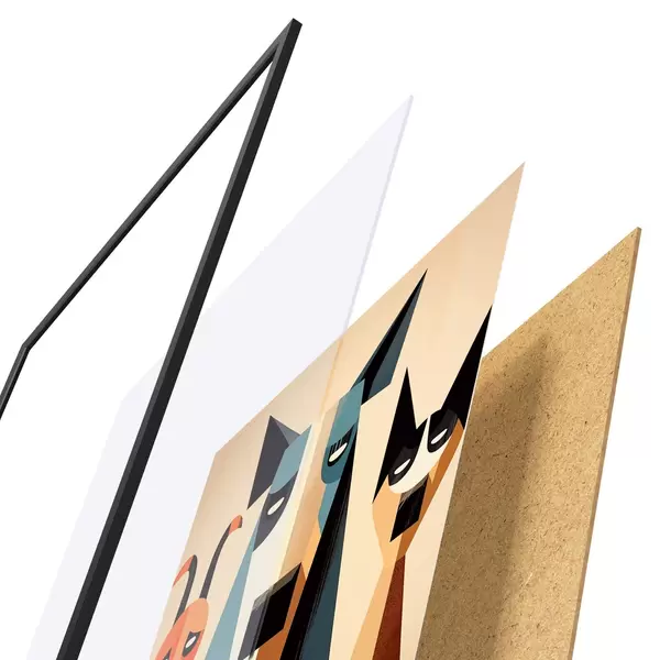De poster bestaat uit een frame, plexiglas, geprinte afbeelding en spaanplaat achterkant. De poster kan meteen aan de muur worden gehangen dankzij de bevestigingen op de achterkant.
